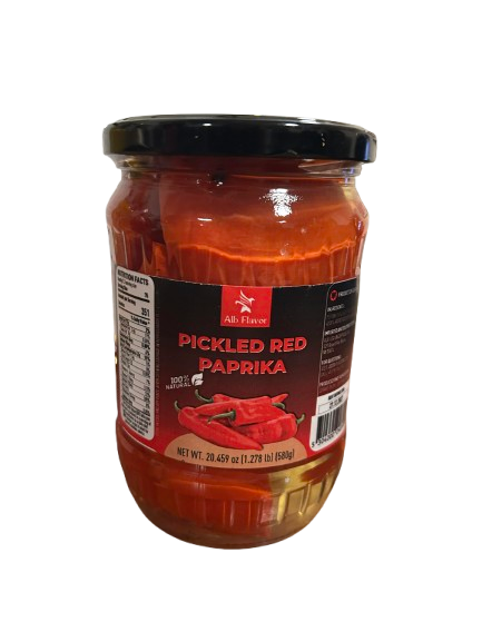 Tender red peppers pickled to perfection, with a mildly tangy flavor and vibrant color, perfect for salads and appetizers.